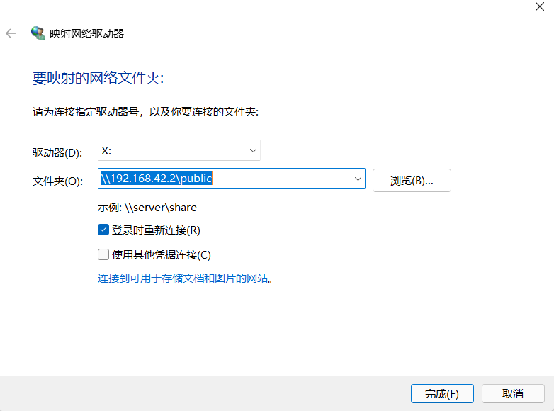若要长期挂载使用,可直接右击“此电脑”,选择“映射网络驱动器”,在界面中输入想要挂载的路径,例如\\192.168.42.2\public