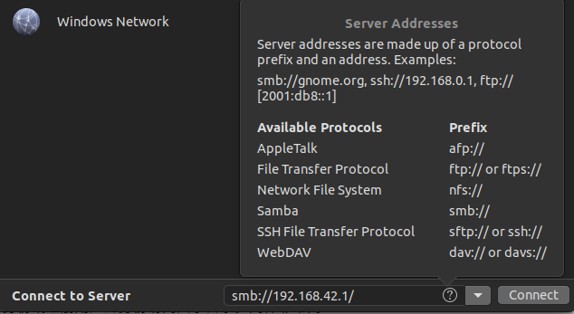 其二,如果系统带有桌面,很多桌面的文件资源管理器都会带有连接samba、ftp等服务的功能,例如我用的Gnome桌面: