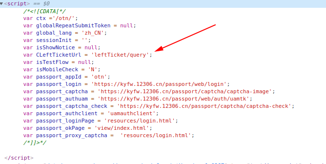 后来我发现,12306的票务信息API经常会发生改变,一会是/otn/leftTicket/query,一会是/otn/leftTicket/queryT,过两天又变成了/otn/leftTicket/queryY,这样老改代码也不是个办法,总得给他自动化一下,经过我的寻找,发现这个API是藏在前面的查票页面的网页中的: