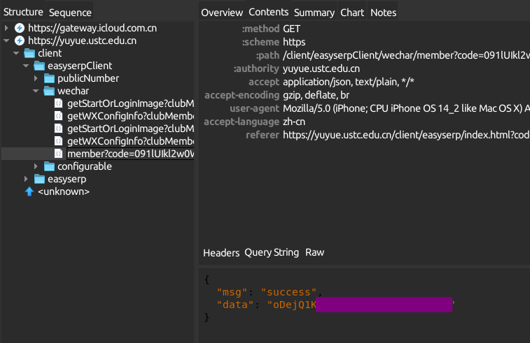 然而,我发现这个token的获取并不容易。经我研究,它应该是和微信号绑定的,而非我们学校的身份认证系统,这是因为在登录身份认证系统之前,就已经抓到包含token的数据包了。最终通过token购得的票,会进入上一次使用该token进行登录的科大帐号下(感觉这种操作有点奇怪hhh)。
