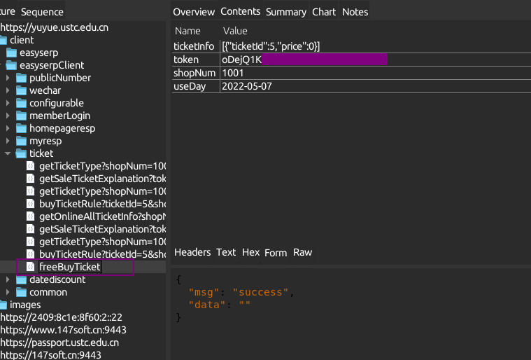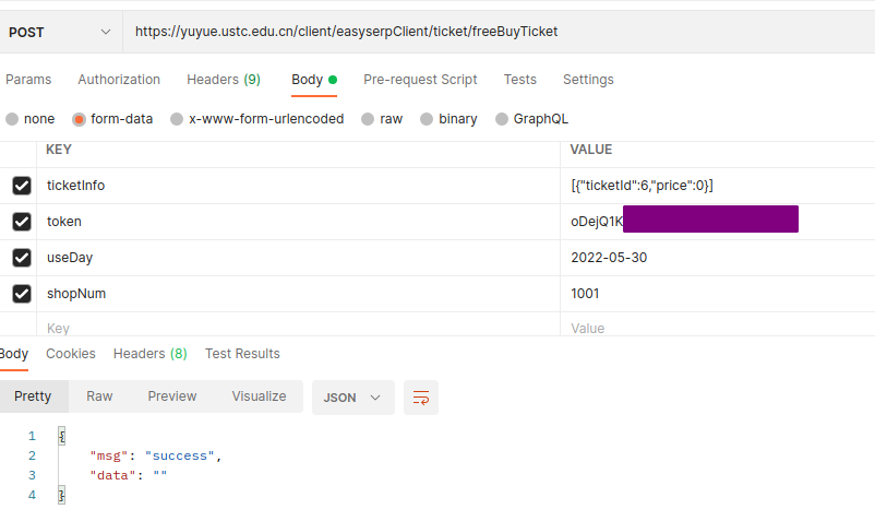 这是条Post请求,向https://yuyue.ustc.edu.cn/client/easyserpClient/ticket/freeBuyTicket发送了一个表单,表单内容为: