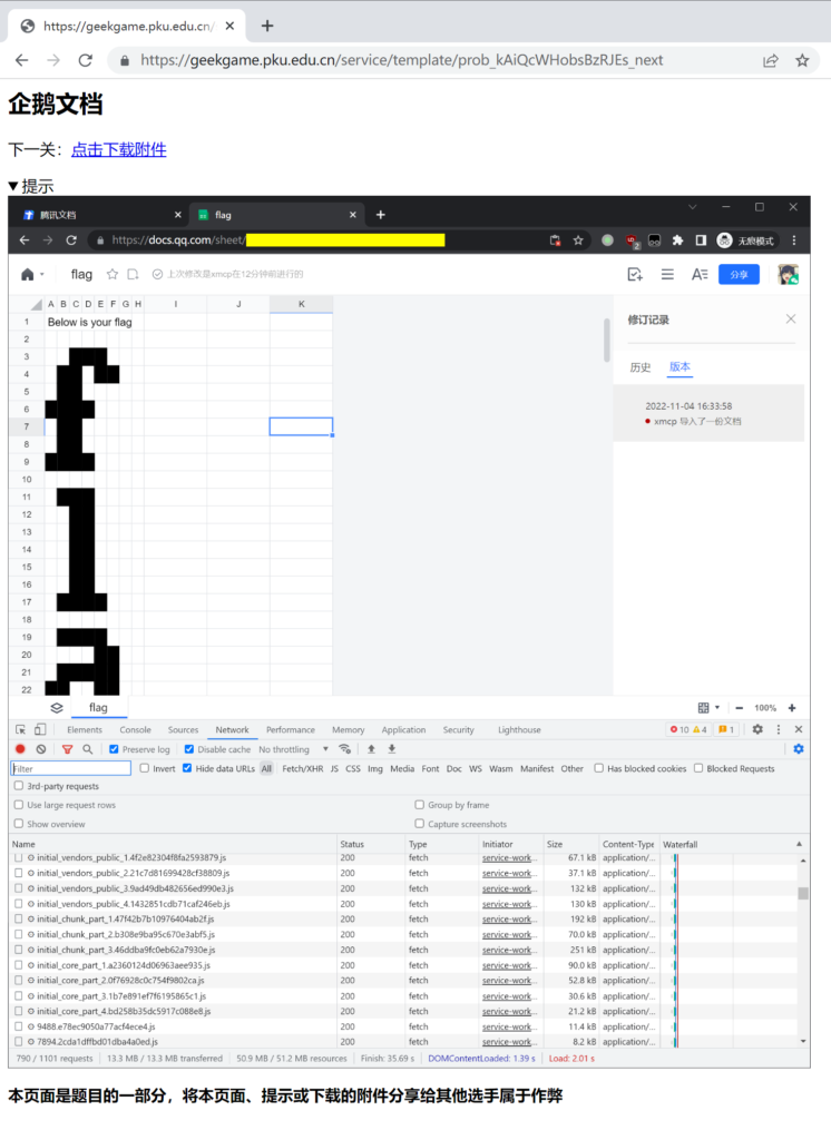 去年的签到我想了半个小时,今年只用了20秒。别问,问就是一模一样,见去年的题解(PKU GeekGame的出题人怎么不在签到题上点心。 官方题解出来后发现其实和去年的签到是有区别的,这次的PDF用某些阅读器打开会发现无法复制,然而我是用Chrome的沙拉查词插件带的PDF阅读器打开的,因此不受影响。