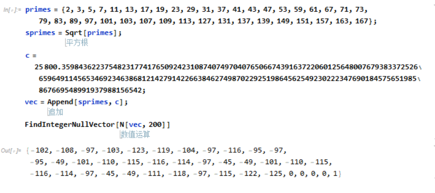 精度提升为200位,方程数量只剩一个,这样用PyTorch肯定不行了,一顿搜索,发现这个问题好像在数学上是一个比较有名的问题,即整数关系问题,有不少算法都支持对该问题进行直接求解,了解到Mathematica中就有一个这样的函数:FindIntegerNullVector。小试了一下: