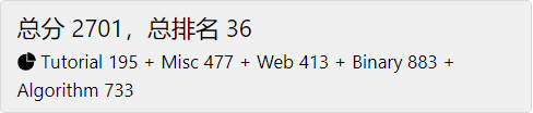今年的比赛顺利取得总排名36/1012(通过签到题的人数),并且在一周的比赛时间内又学到了不少一年前可能学过但又忘了的东西,算是非常有收获。按老规矩,继续写篇题解记录一下本菜狗的解题过程。