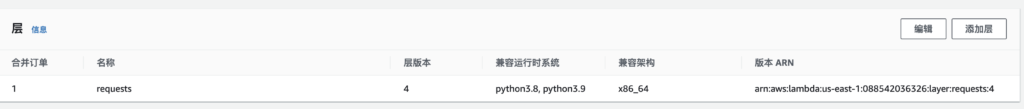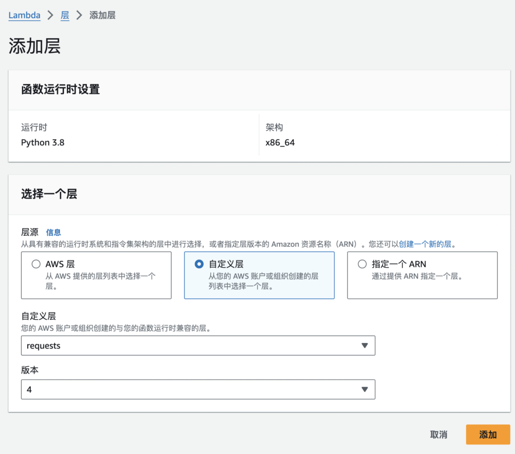 我们在这里添加刚刚创建的层,即可让Python环境拥有requests。