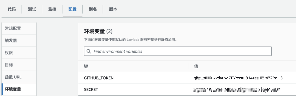 注意到代码最前面读取了俩环境变量,GITHUB_TOKEN和SECRET分别是前面申请的GitHub Access Token和Webhook Secret字符串,为在代码中获取,需要将其设置在Lambda函数的「配置->环境变量」标签栏下: