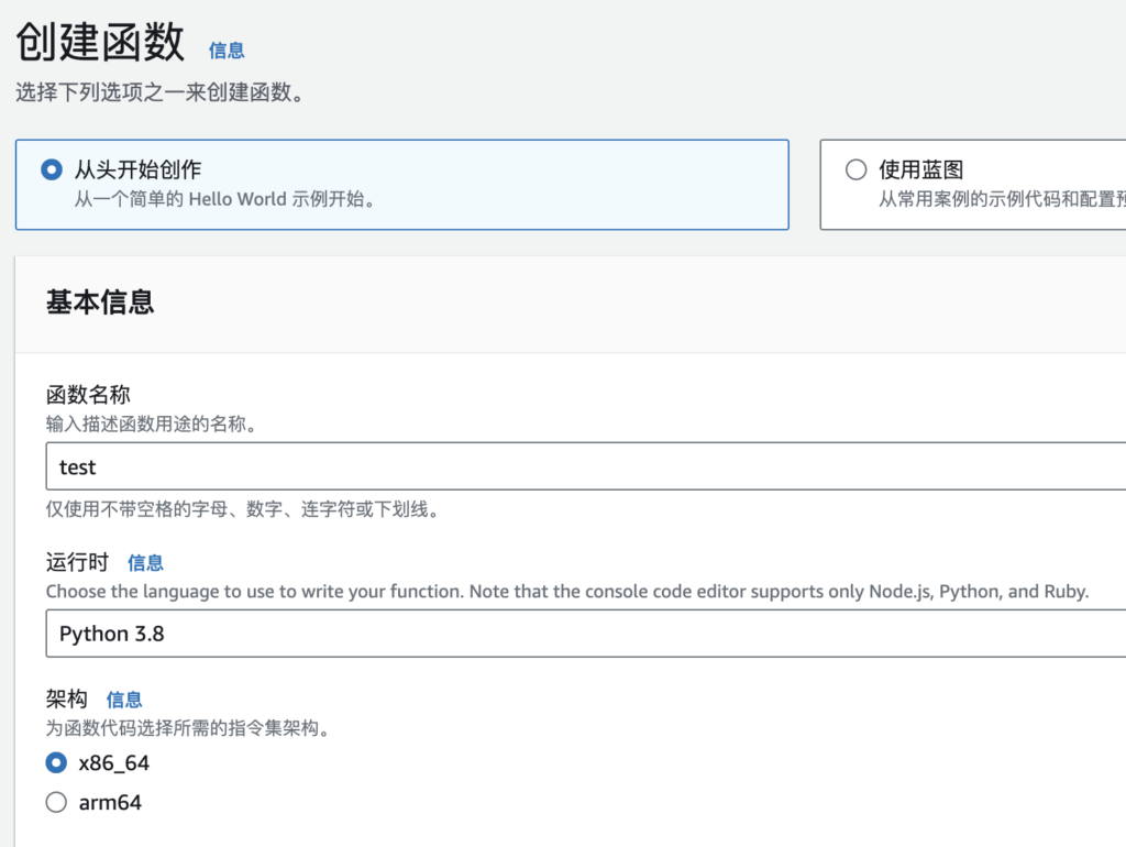 创建一个lambda函数,并选择你喜欢的编程语言(Python 3.8):