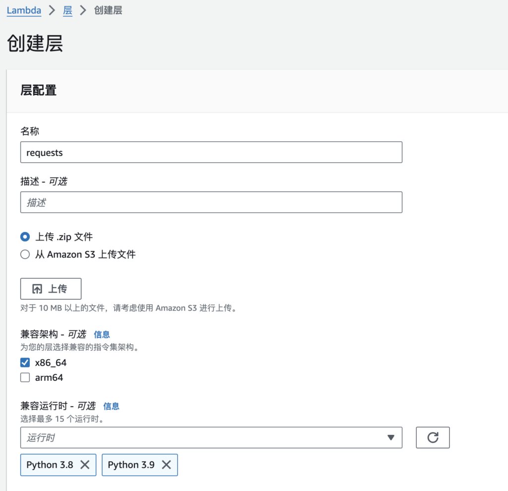 名称可以随意填写,点击「上传」按钮,将前面的python.zip上传,选择几个合适的运行时,点击「创建」。