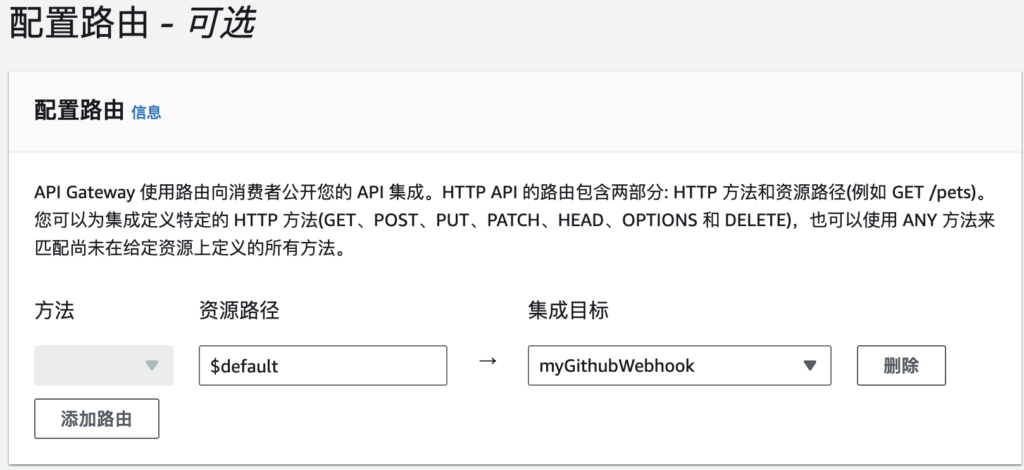 这样便创建好了一个HTTP API,AWS为其分配了一个ID,即下面的87z7tufbtk: