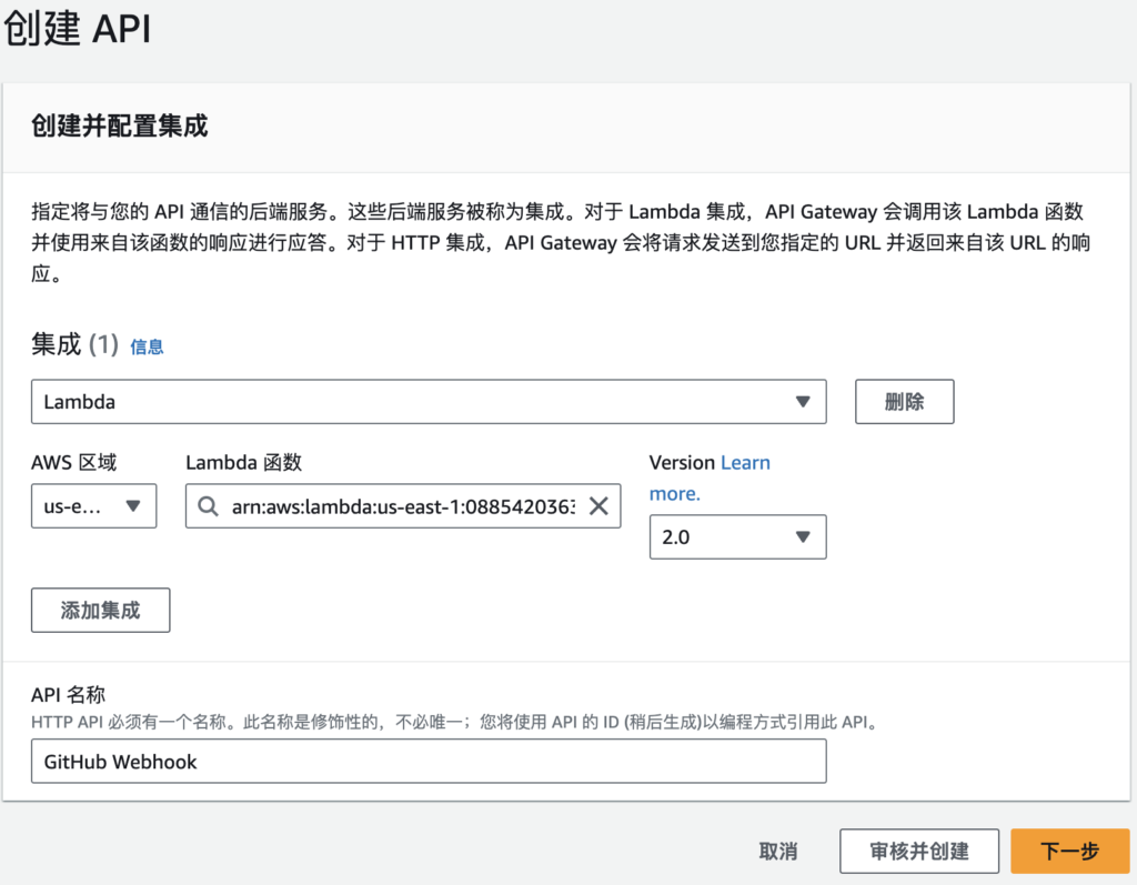 添加一个Lambda集成,并选择前面创建的Lambda函数,最后点「下一步」: